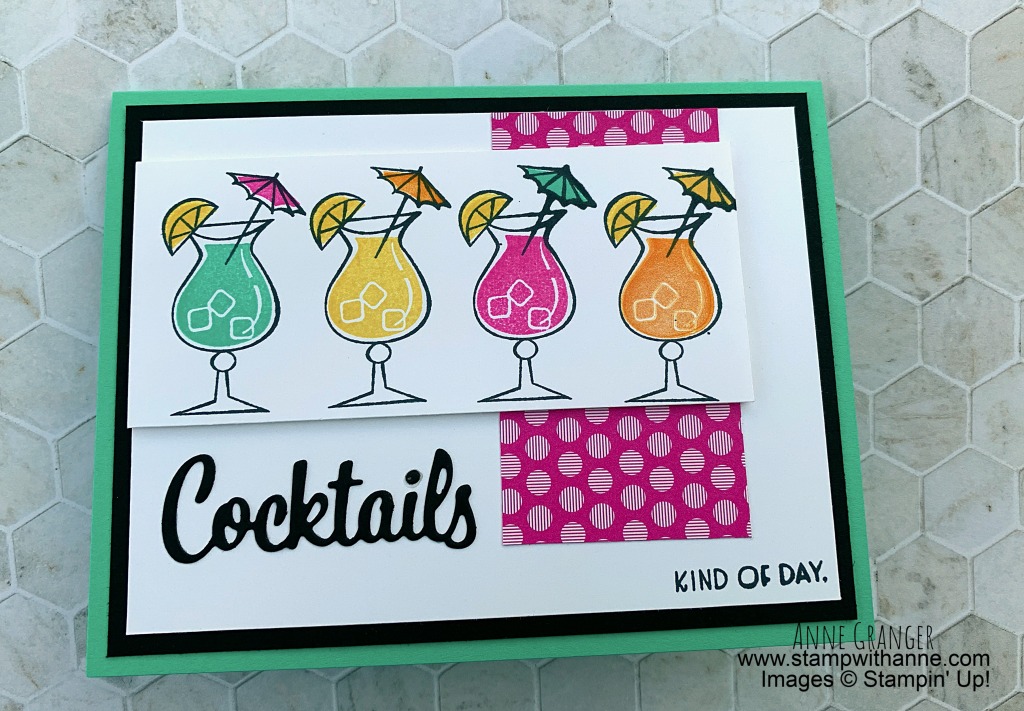 My row of Cocktails was stamped in the Memento Ink onto a piece of scrap white card stock. Then using the ice stamped image, I stamped the drink filling in Bermuda Bay, Daffodil Delight, Magneto Madness and Mango Melody! My inspiration was a tropical party! The lemons were stamped in Daffodil Delight and the umbrella’s were stamped in the same colours as the drink fillings.
