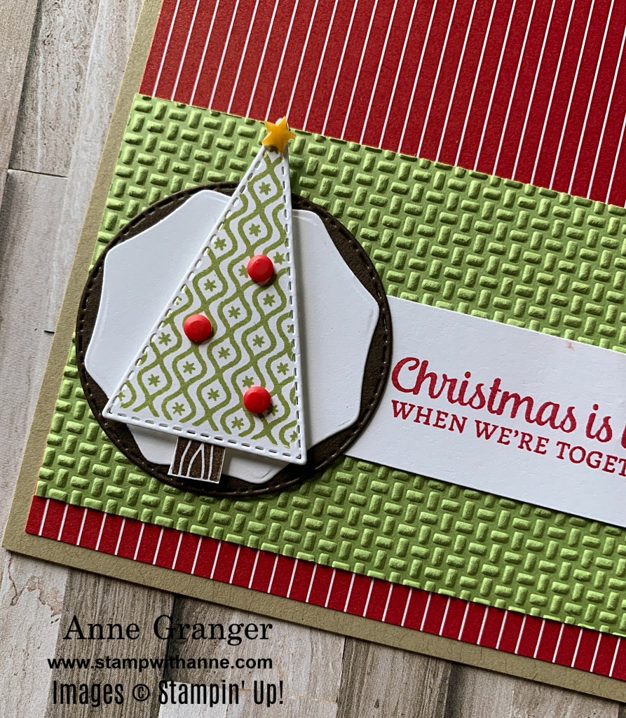 The colours in this card gives you a warm feeling of Christmas with the stripes pattern paper and the pop of green. I used the Wrapped in Texture Embossing Folder to emboss the piece of Pear Pizzaz card stock. I love how it adds that extra texture to the card!
