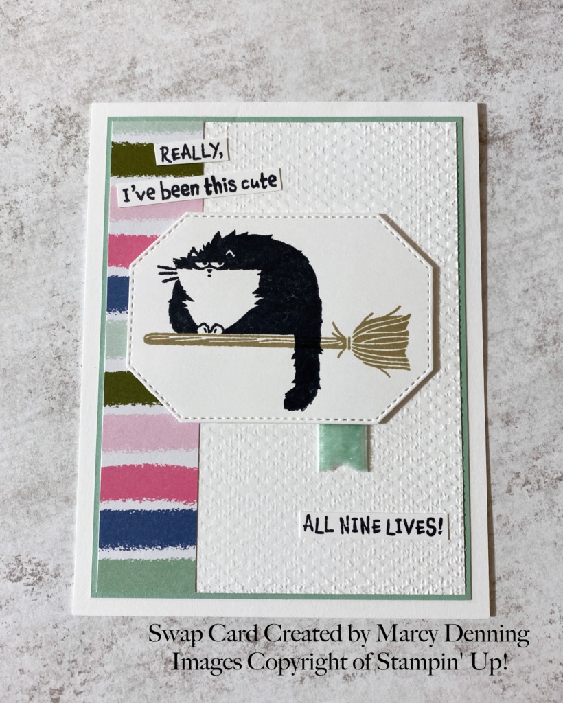 This swap card was designed my good friend Marcy and she used the Clever Cats stamp set. The one thing I love about swaps is that you get to see a variety of styles. I love using swaps cards for sketch ideas, colour cominbation and I get to share idea’s with my customers for products I don’t have. This is one of those sets that I don’t have but after seeing this adorable card, I think I should add to my list.